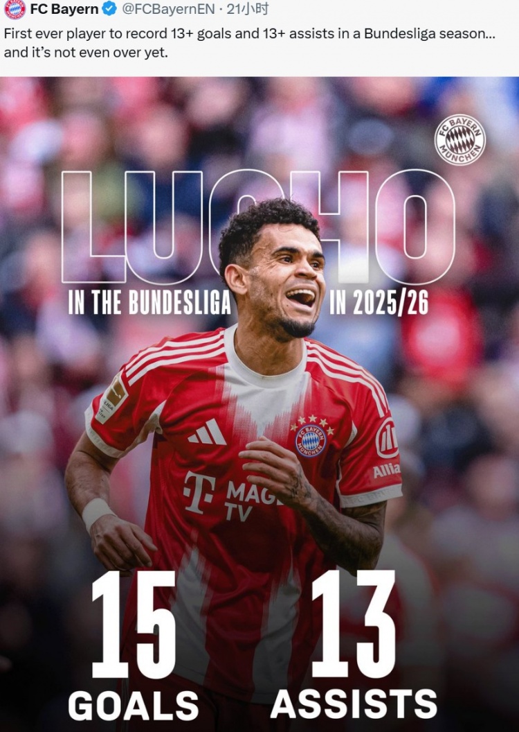 4月22日讯 本赛季30轮德甲之后,拜仁边锋路易斯·迪亚斯已经打进15球并送出13次助攻。俱乐部官推称赞了哥伦比亚人的表现,他们写道:德甲历史首位单赛季打进13+进球并送出13+助攻的球员,而且赛季还未结束。